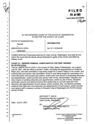 The 28-year-old Abran Raya Leon is accused of first-degree rendering criminal assistance for allegedly driving his wife Misty Raya and his brother Guillermo Raya Leon away from the location of Friday’s shooting at The Pointe Apartments in east Vancouver. According to the documents, the three drove away from the scene in a Toyota Sequoia SUV.