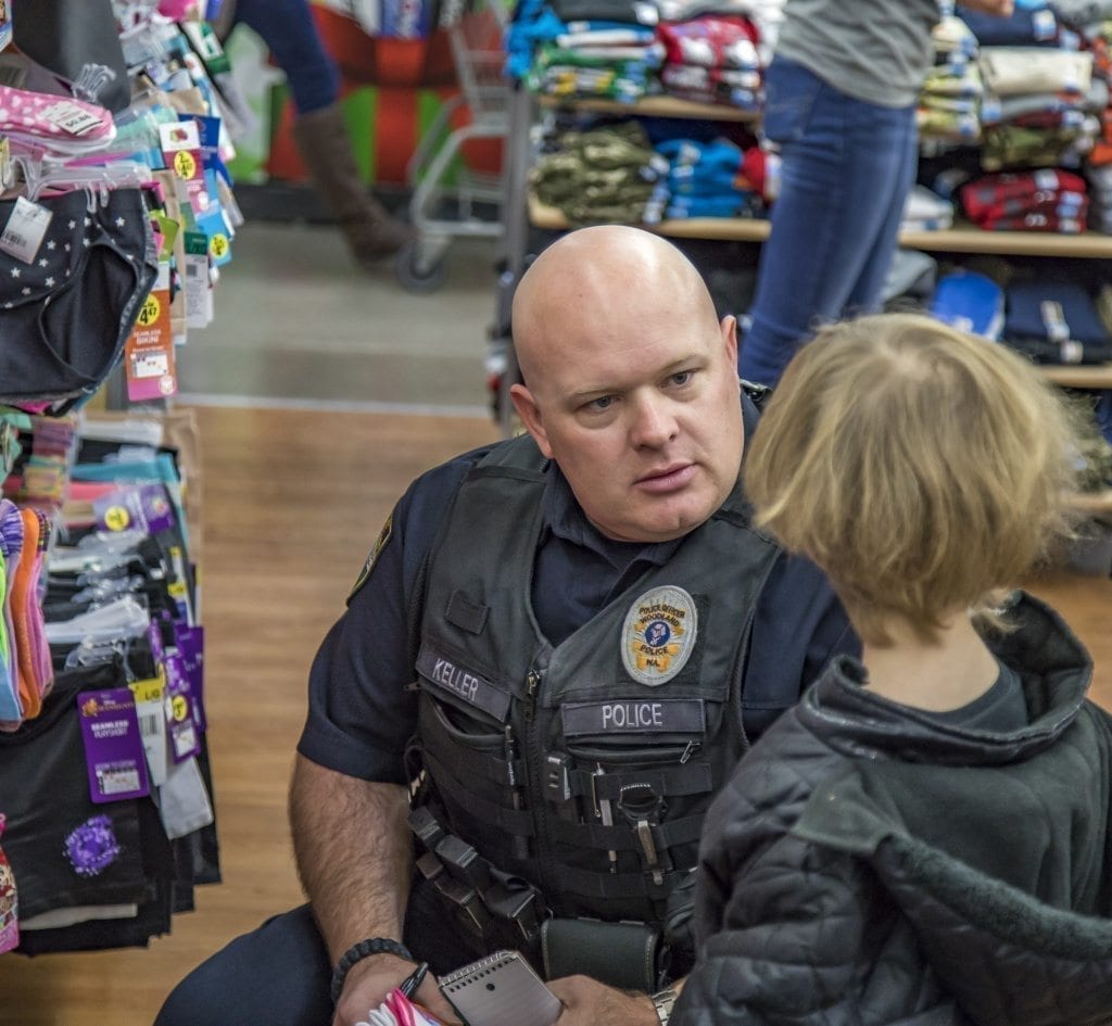 Jim Keller, of the Woodland Police Department, helps this youngster gather his thoughts and implement a strategy at the annual Shop With a Cop event Saturday at the Woodland Walmart. Photo by Mike Schultz