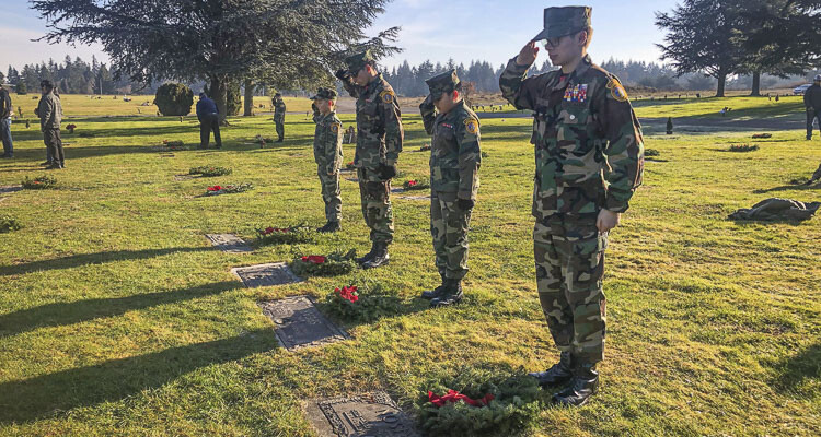 Lewis and Clark Young Marines place wreaths on the headstones of veterans