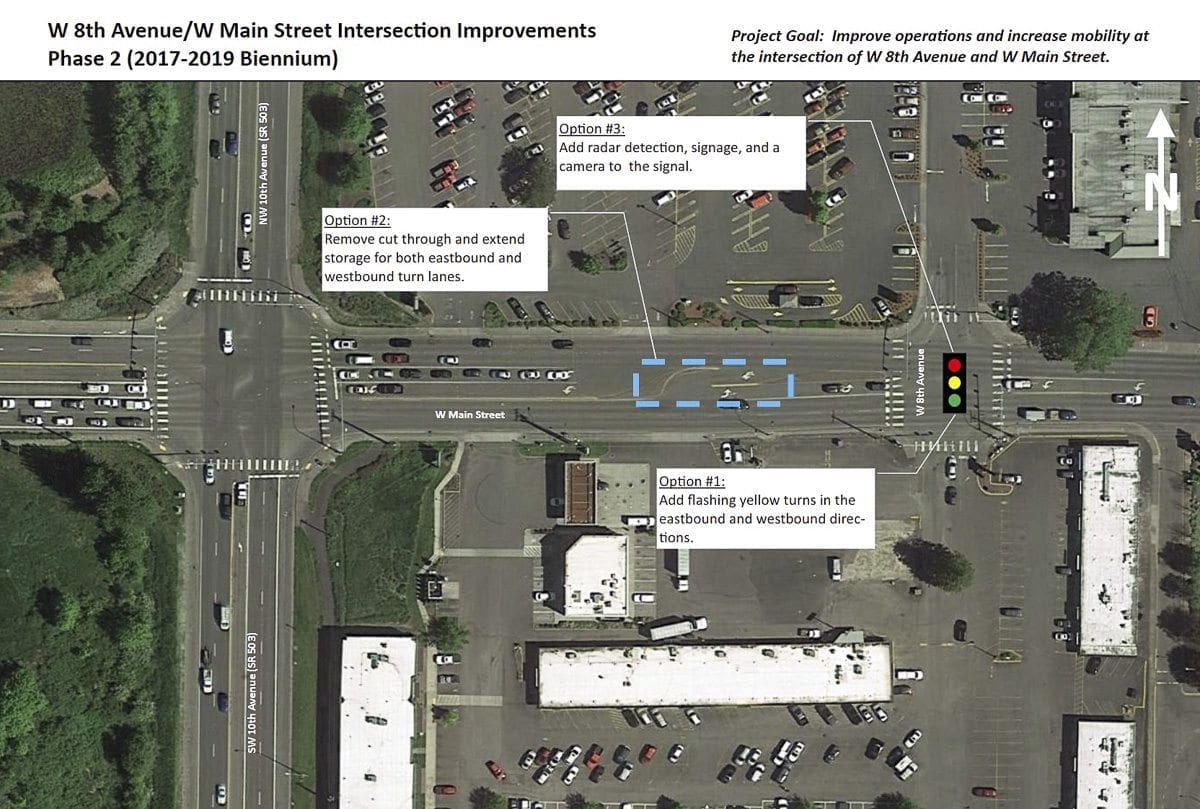 The first two projects slated for Phase II are much less controversial. One will hopefully fix some of the problems with the SW 8th Avenue and Main Street intersection, which serves as the main entrance to the shopping center anchored by Safeway to the north, and Wilco Farm Stores to the south, and often backs up to the SR-503/502 interchange during busy times. Those changes will come around the same time as dedicated right-hand turn lanes at 10th and Main, which should relieve a lot of afternoon east-west congestion.