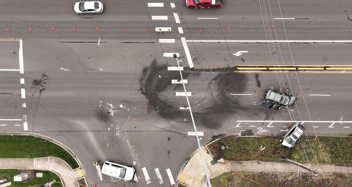 Callers to 9-1-1 reported one of the vehicles traveling at a high rate of speed prior to impact with the other vehicle. Callers stated that after the collision one of the vehicles continued into a power pole at the SW corner of the intersection with power lines down in the street. Clark Public Utilities District (PUD) was called to the scene for the downed power lines.