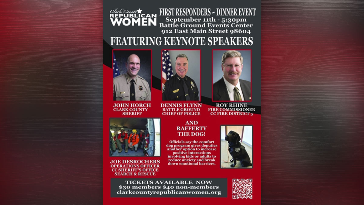 The Clark County Republican Women will host a First Responders Dinner event on Thursday, Sept. 11 at the Battle Ground Community Center, located at 912 East Main Street in Battle Ground. The event is scheduled for 5:30 p.m.