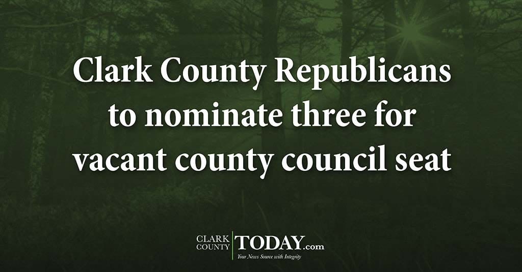 Nominations will be voted upon by Clark County Precinct Committee Officers at the Jan. 15 meeting. The names of the three individuals nominated will then be forwarded to the Clark County Council. Upon receipt of the names of the three nominees, the Clark County Council will review the nominees, conduct interviews in an open public session, and appoint one of the individuals to the office of Clark County Council District 4.