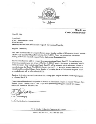 - As a result of multiple performance issues, on May 27, 2004 Horch received written notice of his demotion from the position of enforcement sergeant and returned to his previous appointment as a deputy sheriff II.
