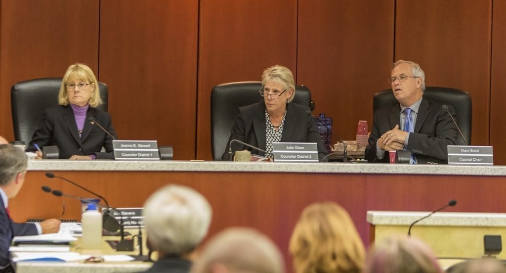 The final days of the budget process included considerable disagreement among the councilors that yielded very few approved amendments to the $321 million budget proposed by County Manager Mark McCauley and his staff. In the end, councilors Marc Boldt, Jeanne Stewart and Julie Olson voted to approve the budget and councilors David Madore and Tom Mielke voted against approval.
