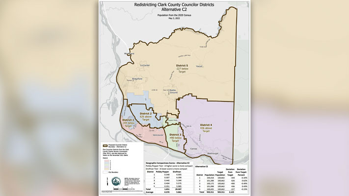 The map was then relabeled C2 after county staff made what was described as a “small adjustment,’’ by Paul Newman, county GIS analyst. Newman indicated that the adjustment was made in the area of Ward Rd., NE Fourth Plain Blvd. and Padden Parkway. It moved about 350 residents into District 4 in order to align the map with election precinct boundaries and a change due to the state’s update of the legislative district.