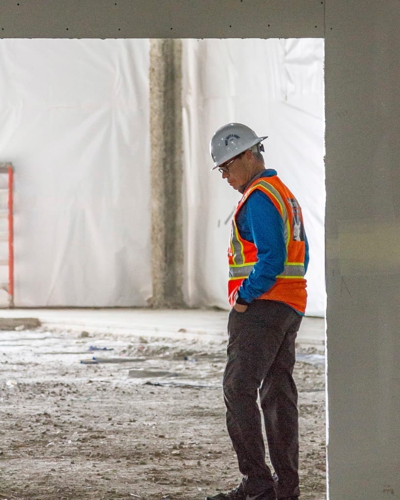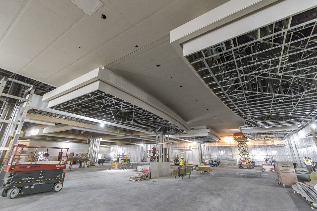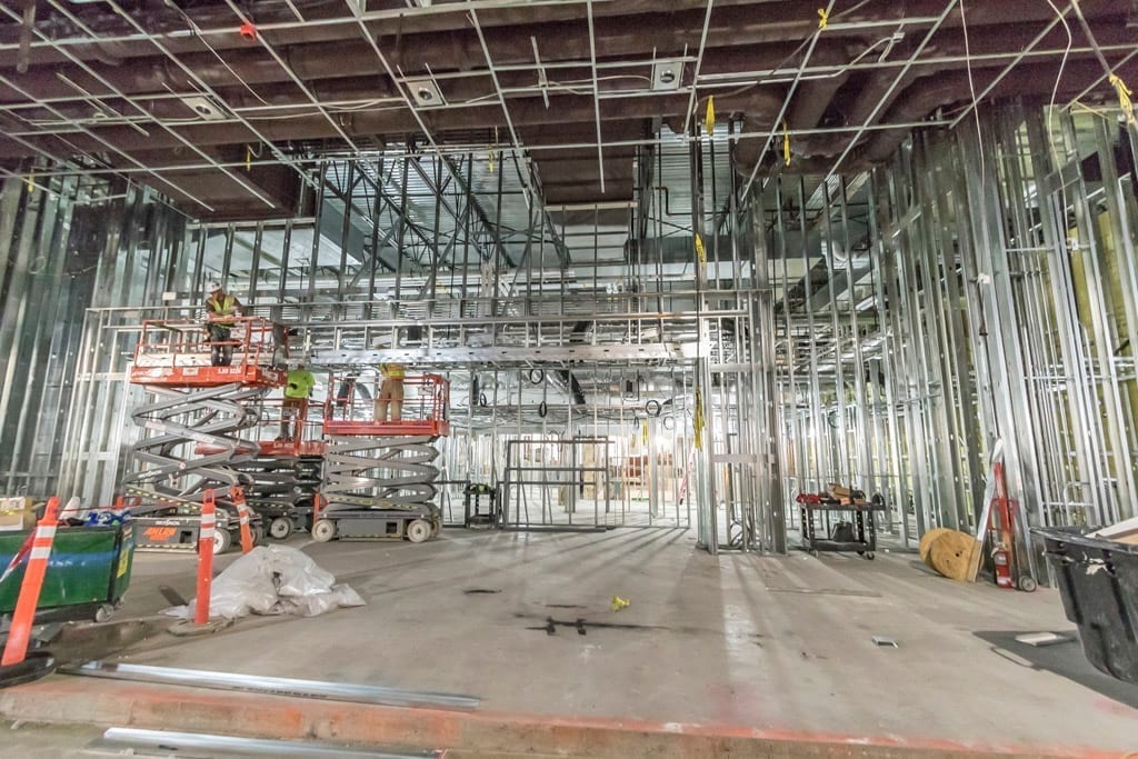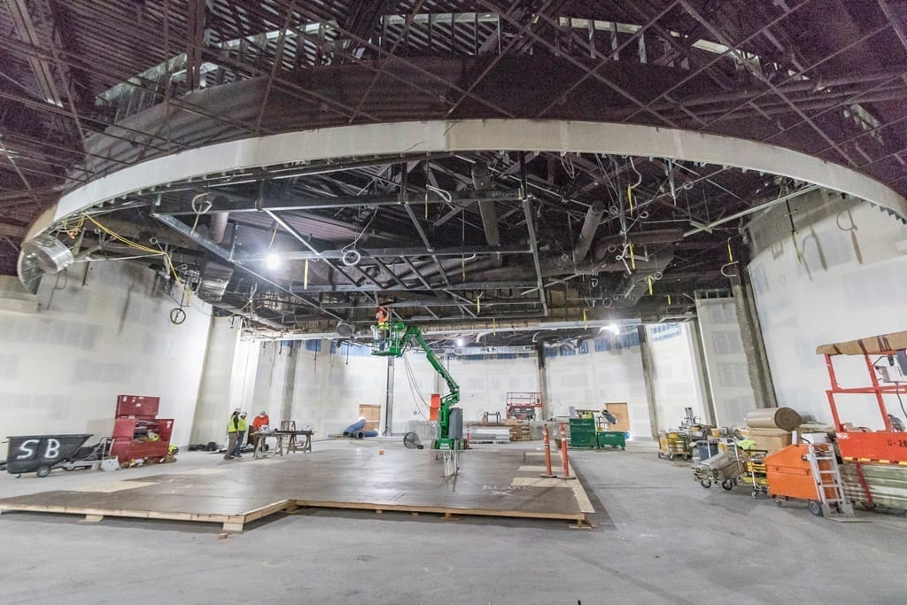 “You know you’re close when the paint is dry,” Fox-LaRose says, stepping gingerly over cords and construction debris on the floor and sidestepping work crews in their hydraulic lifts.
