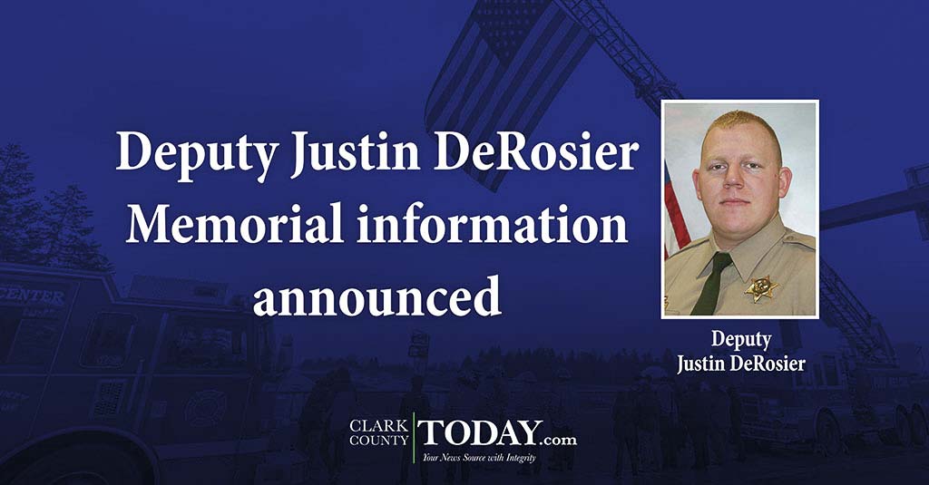 Cowlitz County Sheriff Brad Thurman and the DeRosier family announced today that Deputy Justin DeRosier’s Memorial Service will occur on Wed., April 24 at 1 p.m.