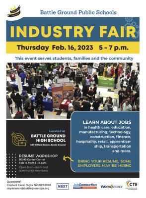 Attend the upcoming Battle Ground Public Schools Industry Fair on Thu., Feb. 16, to learn about apprenticeships and jobs in health care, education, manufacturing, technology, construction, finance, hospitality, retail, transportation and more. Some employers may be hiring so bring your resume.