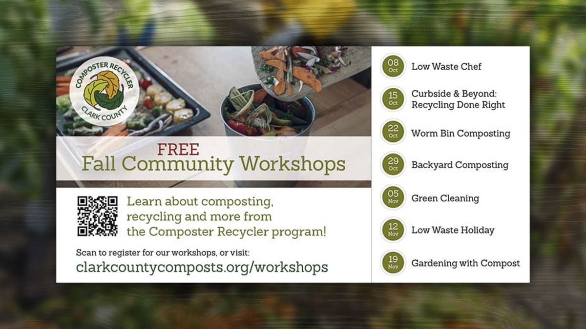 Pre-registration is required for all workshops. To register, visit the Composter Recycler website at clarkcountycomposts.org/classes-and-workshops/current-offerings. Registrants will receive a confirmation email after successful registration. Recordings of previous workshops are also available on the Composter Recycler website.