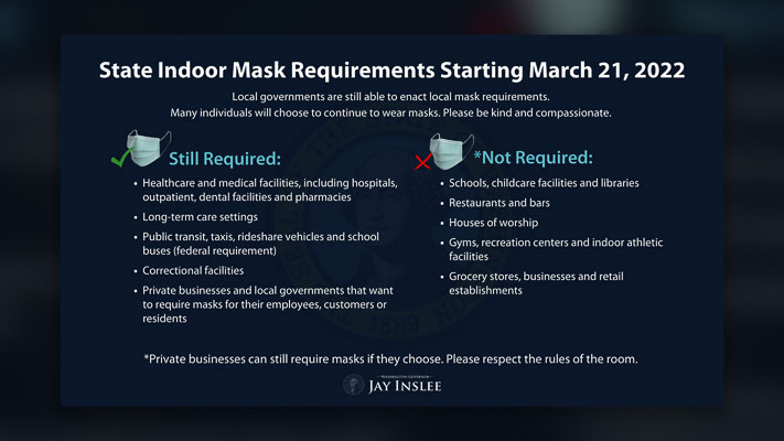 With dropping hospitalization rates, improving vaccination rates, and broad access to masks and tests, Gov. Jay Inslee today announced the state can soon move into a less restrictive phase of the COVID-19 response. The lifting of statewide measures does not prohibit local governments from the ability to enact measures in response to COVID-19 activity in their communities.