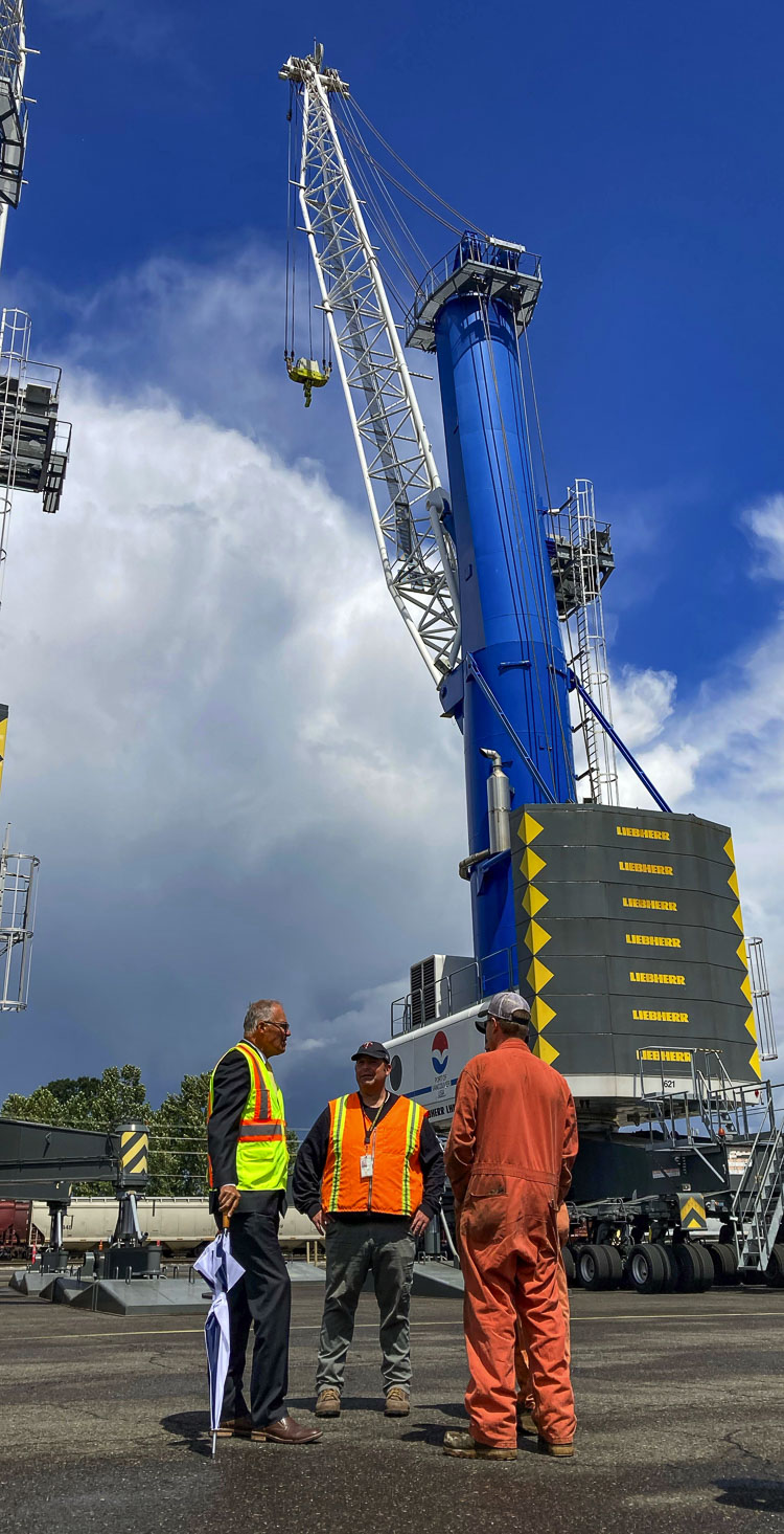 After a brief rain shower, the governor and port staff walked around the Vestas blades and met briefly with two of the port’s Liebherr crane mechanics, where he learned about the intricacies of unloading the delicate but large blades from cargo ships.