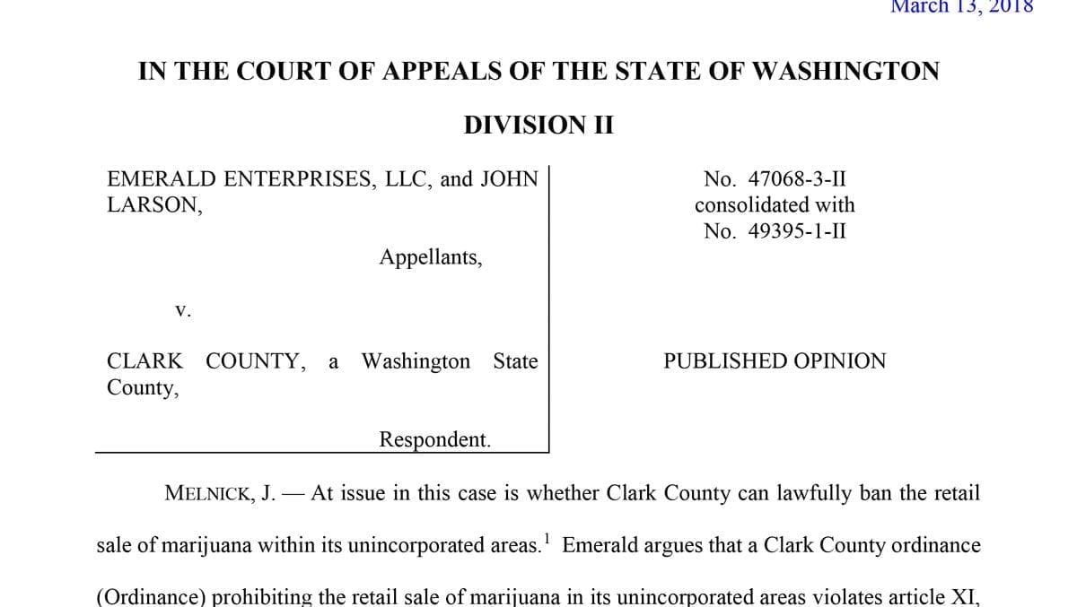 CLARK COUNTY – The Washington State court of appeals has unanimously sided with Clark County, and against the owner of a pot shop in Hazel Dell. John Larson, owner of Emerald Enterprises, which runs Sticky’s Pot Shop on Highway 99, has argued the county’s marijuana ban runs afoul of the state constitution, because it prohibits something allowed by state law.