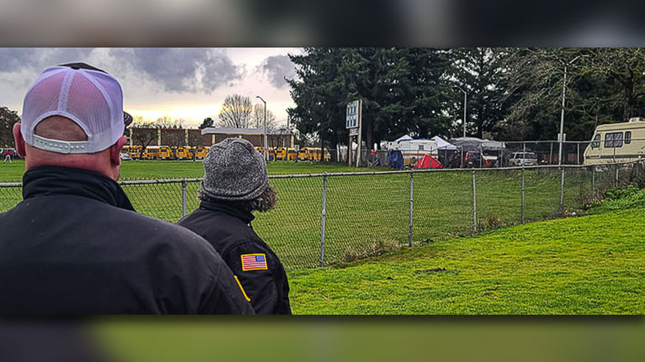 The homeless camps, with RVs, cars, trucks, tents, and tarps, are lined up along NE Campus Drive and a parking lot, behind the high school’s baseball and softball fields, as well as the Little League fields. Fort Vancouver track and field athletes are near the camps as well. One campsite is up against the fence where javelin throwers will be lining up when the school hosts track meets. Off in the distance is the school’s soccer field, as well.