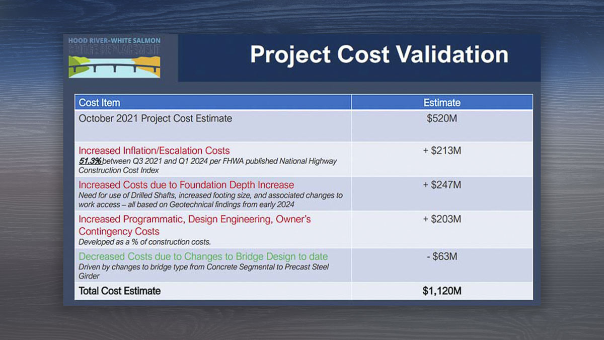 Michael Shannon, project director, indicated inflation was responsible for 51 percent of the cost increase, or $213 million. Soil samples in test drilling sites indicated the bridge piers will need to be approximately 90 feet deeper than planned. That will add $247 million to the cost.