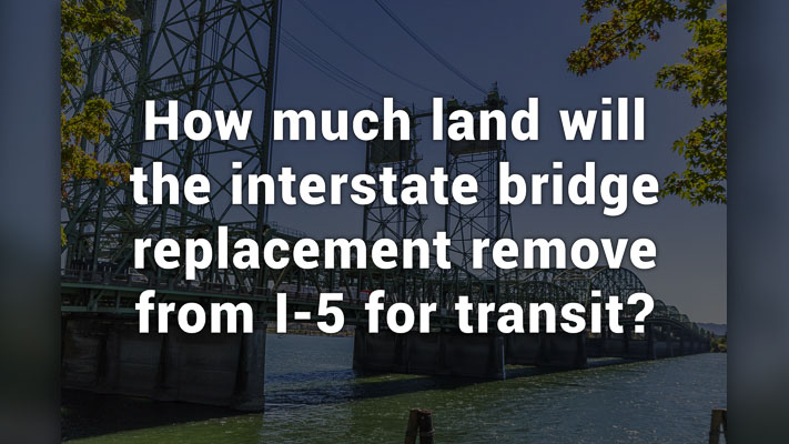 On a city street, like running down Interstate Avenue or on the I-84 MAX line next to the freeway, there is roughly 35 to 40 feet required when two sets of tracks are put down, side by side. That’s the equivalent of three 12-foot vehicle lanes. Real estate for cars and trucks is already at a premium on I-5 according to the IBR team, especially within the five-mile bridge influence area the IBR has under its authority.