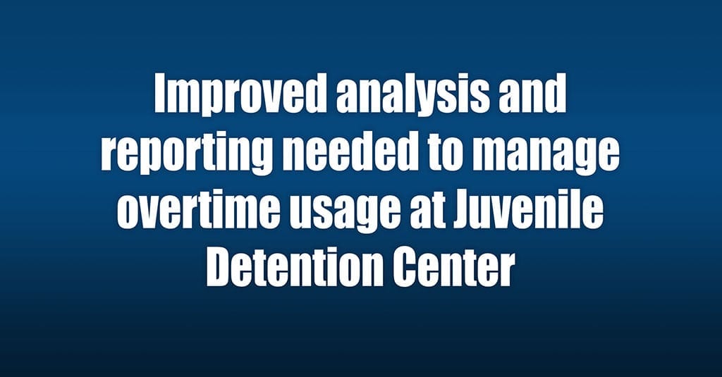 The audit focused on Juvenile Court overtime use in 2013 through 2015 to staff the detention center. Auditors said it was a “challenging environment” as three dynamics pulled the organization in different directions: the county was seeking budget cuts; overtime use and cost were rising; and employee availability to work was decreasing. During this time, management did not collect or use performance data to manage staffing levels.