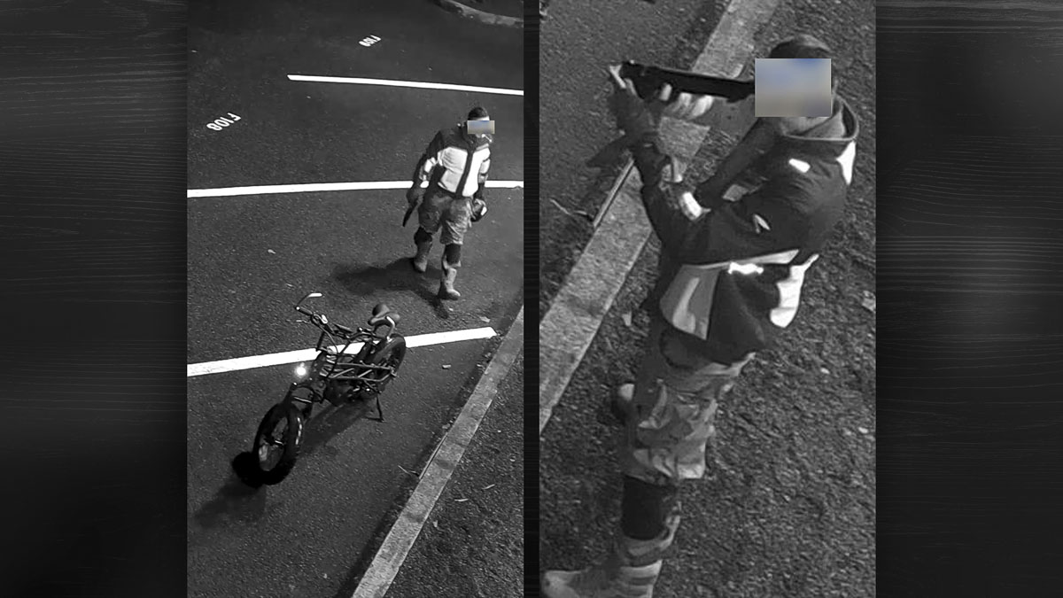 The subject, dressed in camo pants and a motorcycle jacket, remained on the county campus briefly before donning a motorcycle helmet, and mounting an electric bicycle with the gun against his head.