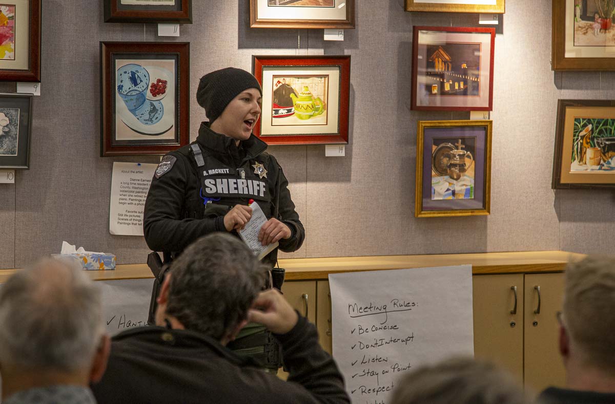 Following Boyer’s presentation, Deputy Hackett introduced herself to the group and explained the process for lodging criminal complaints, emergency and non-emergency, with herself and CCSO. Hackett, originally from Battle Ground, has been working for the county since July. During her presentation she received several questions regarding target practice shooting and ordinances surrounding it.
