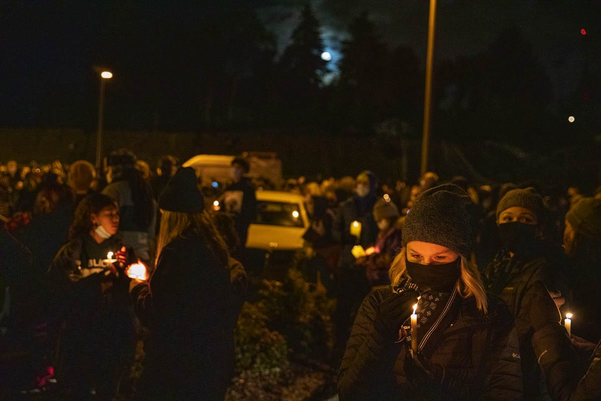 A crowd of hundreds gather Friday evening for a vigil to honor Kevin E. Peterson, Jr. who died Thursday in Hazel Dell after being shot by Clark County Sheriff’s Deputies. A small group of counter-protesters gathered across the street, but things remained relatively peaceful by 8 p.m.