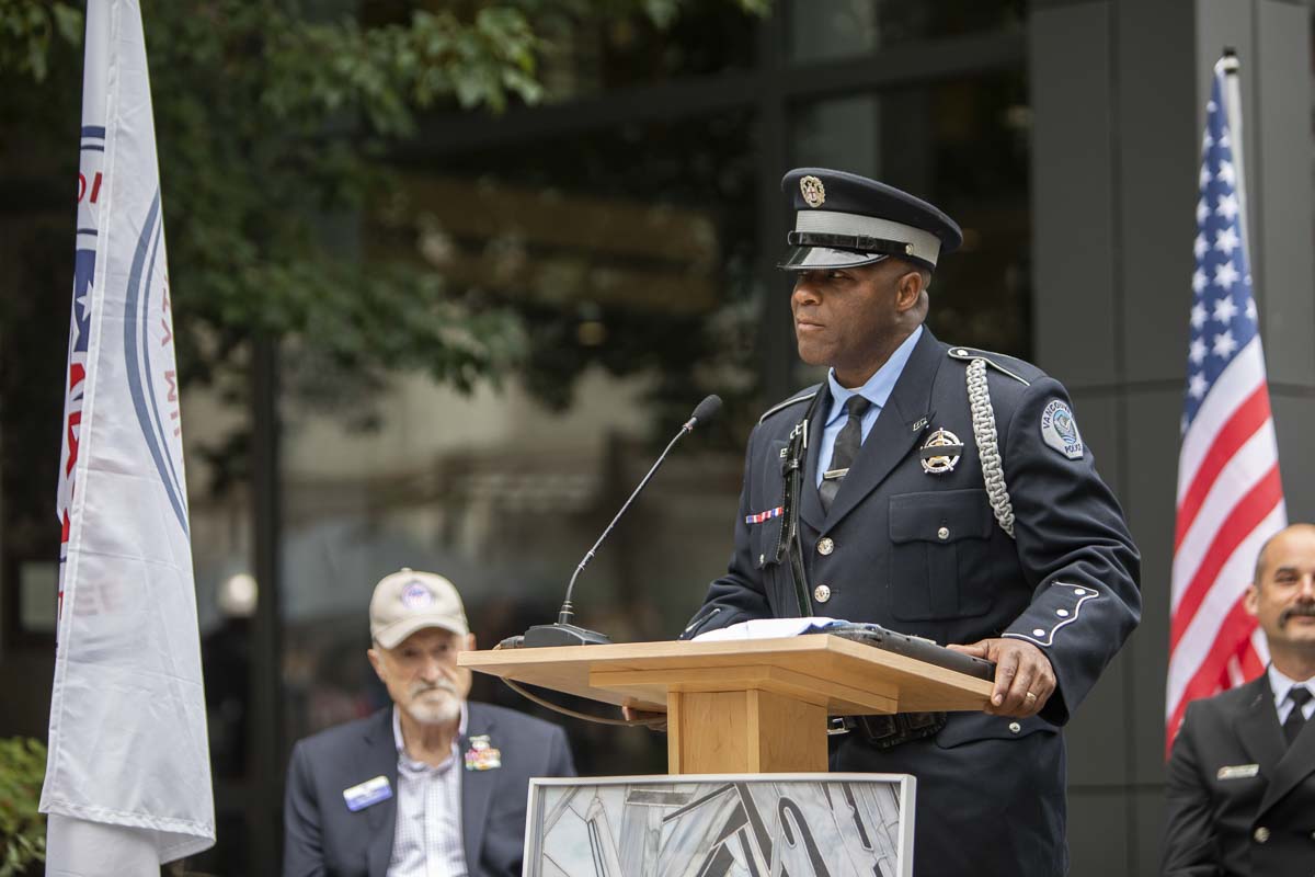 In addition to leading “God Bless America,” Officer Reynolds also sang the National Anthem. Main remarks were delivered by Vancouver Mayor Anne McEnerny-Ogle, Assistant Police Chief Mike Lester and Division Fire Chief Tom O’Connor.