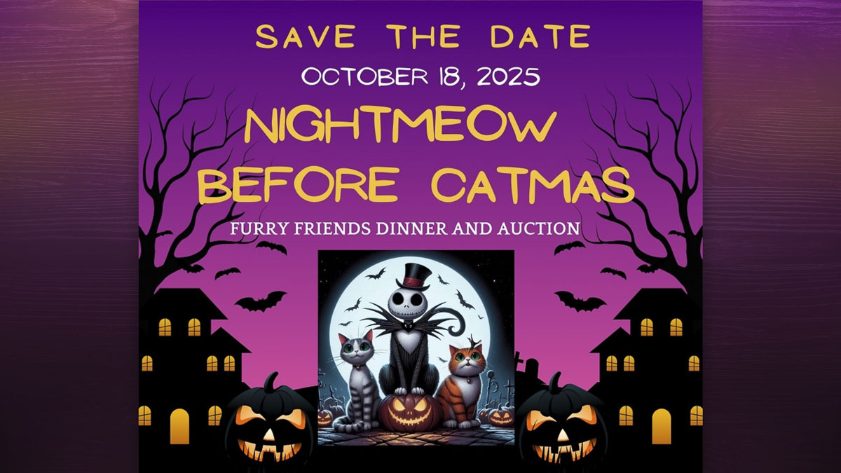 Your ticket to the auction includes appetizers, a choice of one of our three dinner entrees, a complimentary drink coupon and access to all the bidding. Doug Quinn will be the auctioneer for this event. He has donated his magical calling skills to our auctions for six years now. Can’t make it to the auction, no need to worry, there will also be an online auction happening Thursday, October 16 at 6 p.m. and will end on Monday, October 20 at 6 p.m. Tickets are available now at Auctria.events/NightmeowBeforeCatmas.