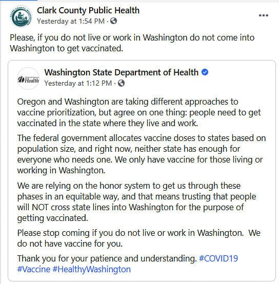 “The federal government allocates vaccine doses to states based on population size, and right now, neither state has enough for everyone who needs one. We only have vaccine for those living or working in Washington.