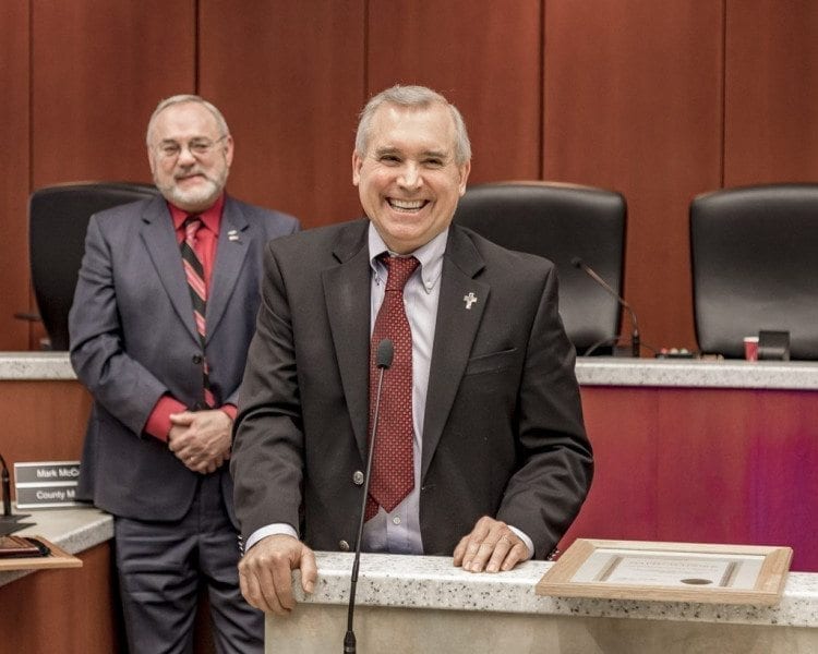 “Today, we say goodbye to Tom Mielke and David Madore,’’ said Clark County Assessor Peter VanNortwick. “I want to say it has been a pleasure serving with both of these men. We may not agree on every issue, but in politics that rarely happens. I have enjoyed Tom’s humor and consistency. I will miss hearing his chuckle in his mic on CVTV. I always knew when it came to labor contracts or employee hiring throughout the county, I would always have a fellow commissioner that would agree with me. Tom has his own view of the world and stayed consistent to that view throughout his public service. I thank Tom for his service.