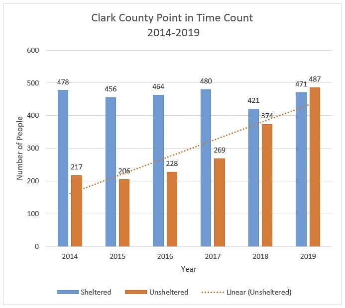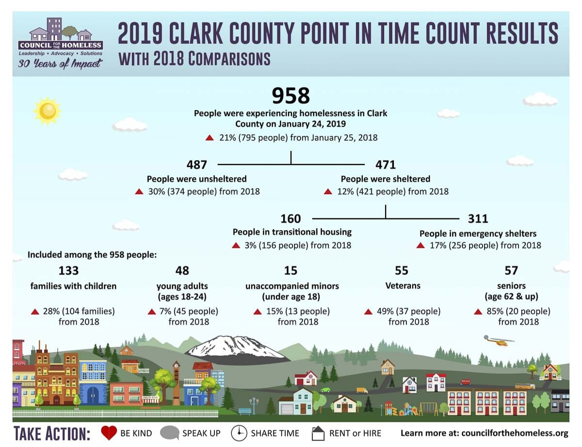 “It aligns well with the trends we’re already seeing throughout Clark County: that the numbers of people that are already experiencing homelessness, whether they’re sheltered or unsheltered, continues to rise,” says Kate Budd, director of Council for the Homeless which conducted the annual count January 24 with the help of 30 volunteers.