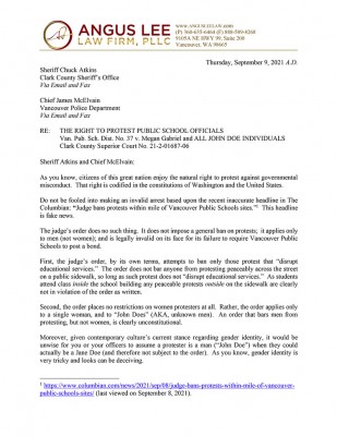 Vancouver attorney Angus Lee has issued a strong rebuke of a Superior Court judge’s decision to grant an injunction against protests within a mile of Vancouver Public Schools sites. Lee offered his reaction in a letter sent Thursday to Clark County Sheriff Chuck Atkins and Vancouver Police Chief James McElvain.
