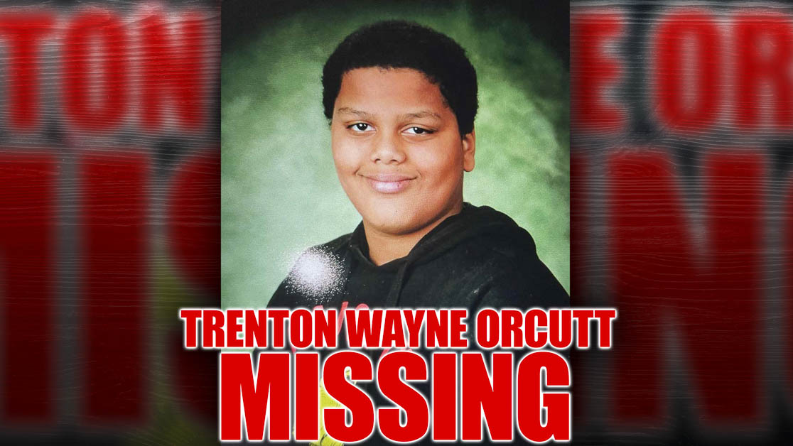 Missing juvenile is Trenton Wayne Orcutt, 11 years old. Trenton is described as a black male, with brown eyes and black short afro hair. He is approximately 5–foot-7 and 250 pounds. Trenton was last seen wearing a black T-shirt, black shorts, black or yellow shoes.