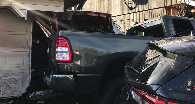The driver continued through the retaining wall into the next house, colliding with a parked vehicle, moving it out of the driveway. The truck hit the garage door, causing the residence significant damage. The truck finally came to rest as it struck a residence on SE McGillivray Blvd., taking out the corner section of the garage.