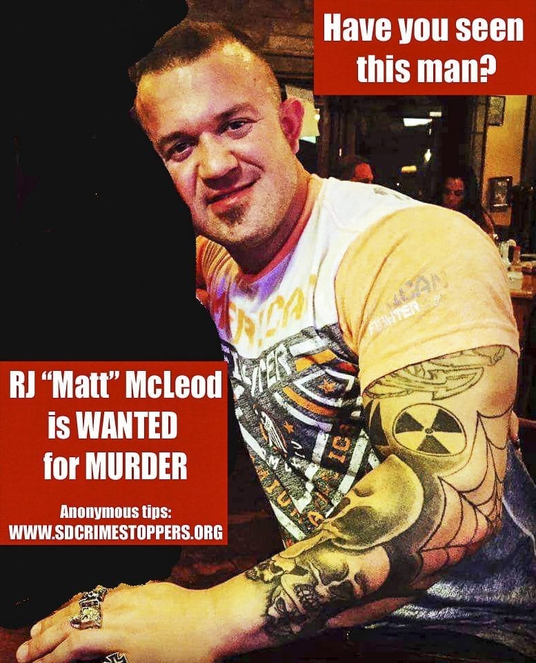 McLeod is a former United States Marine who may have access to weapons. McLeod is a white male, 34-years-old, 5-feet-11 inches tall, weighs 245 pounds, and has multiple, recognizable tattoos on both of his arms. McLeod also goes by the nickname of “RJ” but may be using the name “Matt” or “Mateo” in attempt to hide his identity. McLeod may have put on weight and is likely to have a beard.
