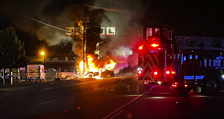 The fire could not immediately be extinguished due to the active power lines. Once the power was cut off by Clark PUD, the fire department was able to address the flames.