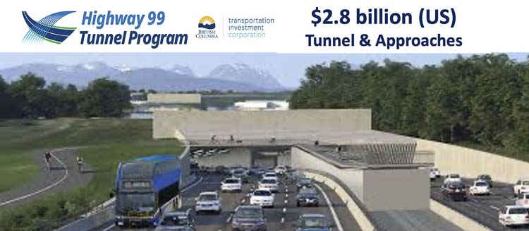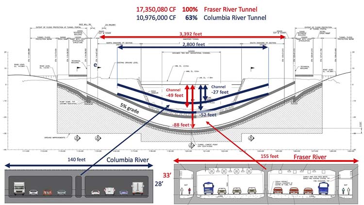 British Columbia’s “Highway 99 Tunnel Program” is building a new eight-lane immersed tunnel under the Fraser River to replace the 68-year-old four-lane Massey Immersed Tunnel. The B.C. tunnel and approaches is estimated to cost $2.8 billion (US). A similar I-5 immersed tunnel and approaches should cost no more than $2.8 billion. An I-5 Columbia River immersed tunnel would be 600 feet shorter, 35 feet shallower, and about 40% smaller overall.