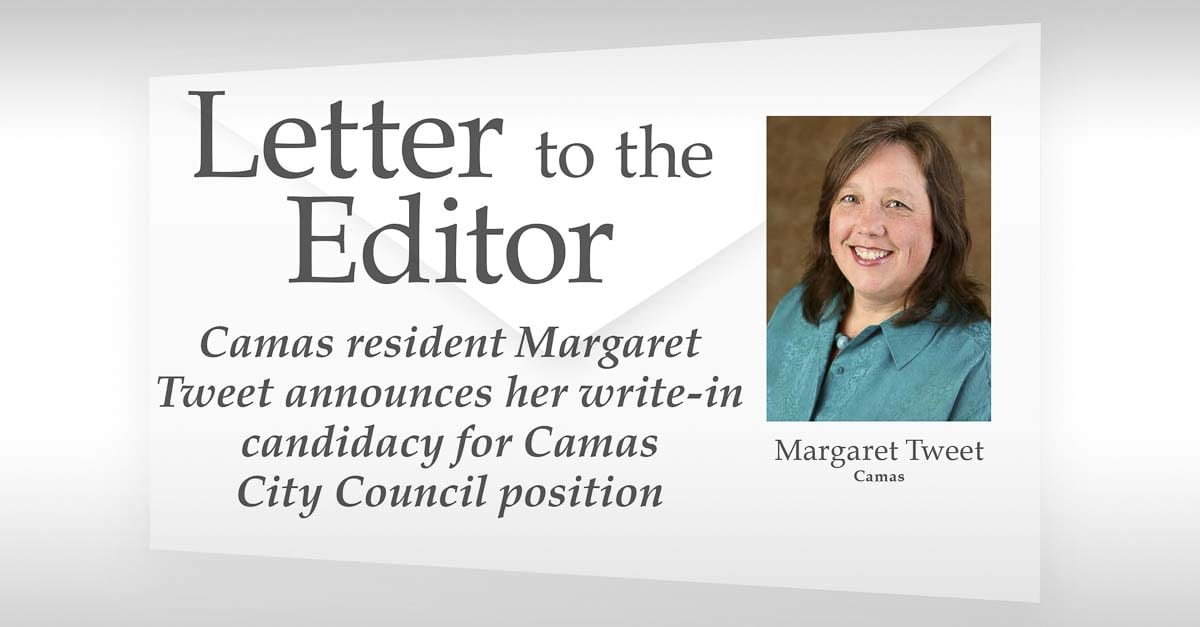 I’m Margaret Tweet a write-in candidate for Camas City Council Ward 3, Position 1. I would like to preserve our natural spaces and lakes, am fiscally responsible, and would put citizens first. Currently, highly paid consultants, with vested interests in outcomes, overly influence city decisions about projects, taxation, development, and city parks.