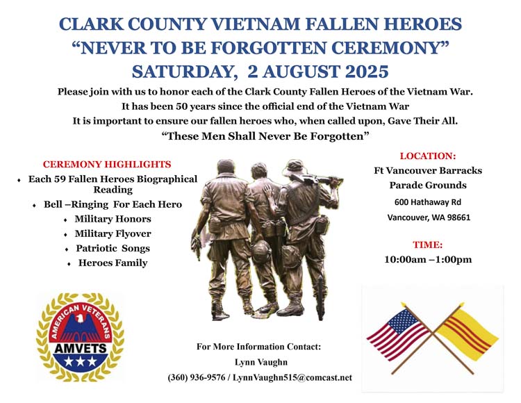 In a long-overdue tribute, the Vietnam War Fallen Heroes Remembrance Ceremony will take place on Sat., Aug. 2, at the historic Fort Vancouver Barracks Parade Grounds. The community is invited to attend this solemn and significant event, which will mark the first time that all 59 of Clark County’s fallen Vietnam War heroes are honored together in a single public ceremony.