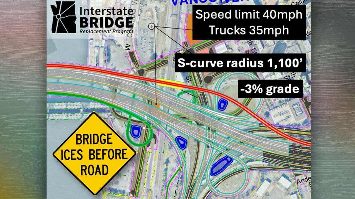 Driving north on the current I-5 Bridge on the Vancouver riverbank, a driver must make a slight right turn, followed by a slight left turn, completing a gentle S-curve on the ground. The IBR’s new bridge will be about 300 feet west of the current bridge. To connect a new bridge to the existing freeway, an elevated approach with a -3% grade and an extreme S-curve must be built. This S-curve will be dangerous and restrict speed to about 40 mph.