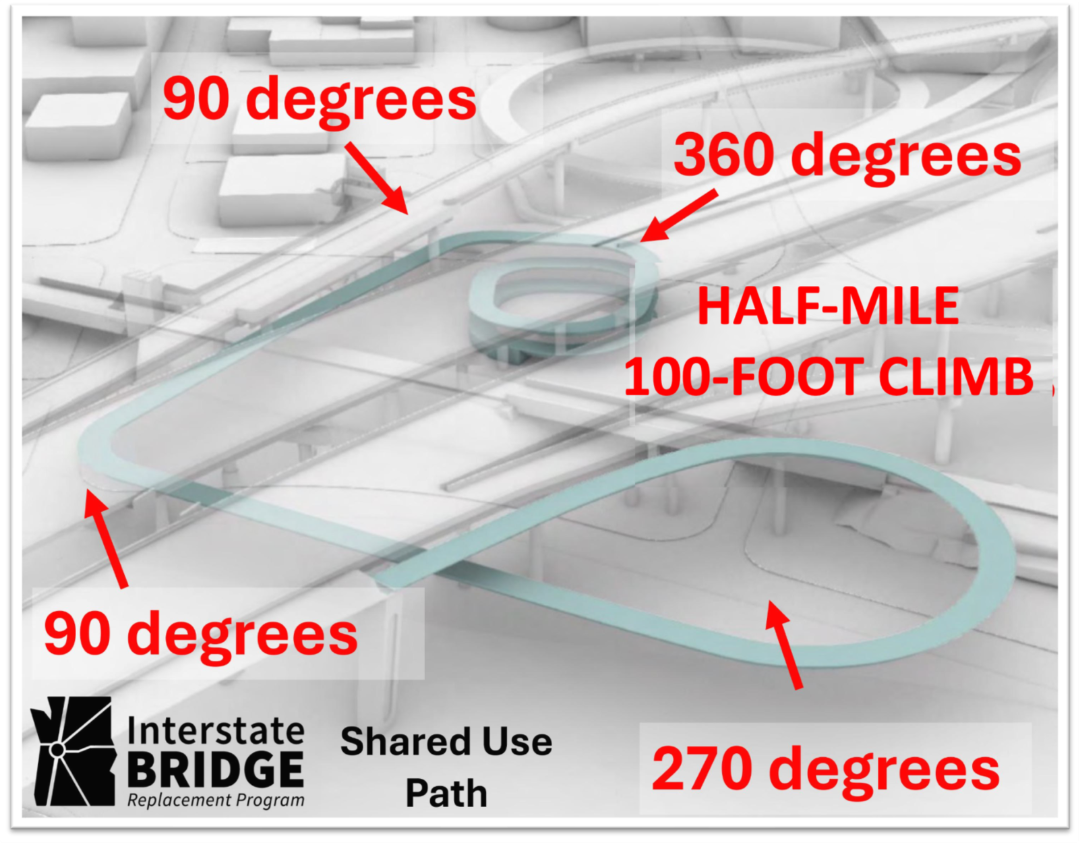 Three years ago, I created and posted a graphic of a possible “Shared Use Path.” The graphic accurately depicted the difficulty of a 100-foot climb to the bridge level. Interstate Bridge Replacement Program (IBR) officials were not happy with my depiction and promised to consider future multiple ramp designs.