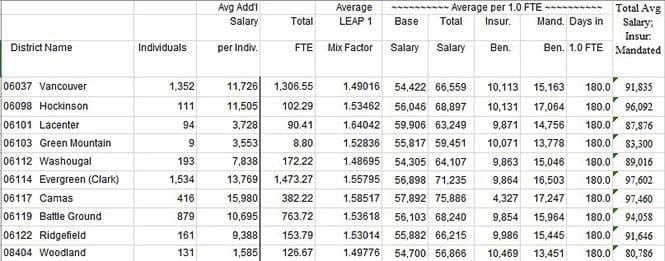 Let’s take the best paid district by average: Evergreen at $97,602. That number is comprised of an average base salary of $56,898 multiplied by a mix factor of 1.55795 = $71,235. Wait…what’s a mix factor? Answer: The tenure and education level. The higher the multiplier the more years of experience and/or advanced education. A larger number generally means more experienced teachers. Add to the $71,235 the Insurance Benefit value ($9,864) and the Mandated Benefits (sick leave, maternity leave, retirement, etc.) of ($16,503) and the fully loaded average cost is $97,602.
