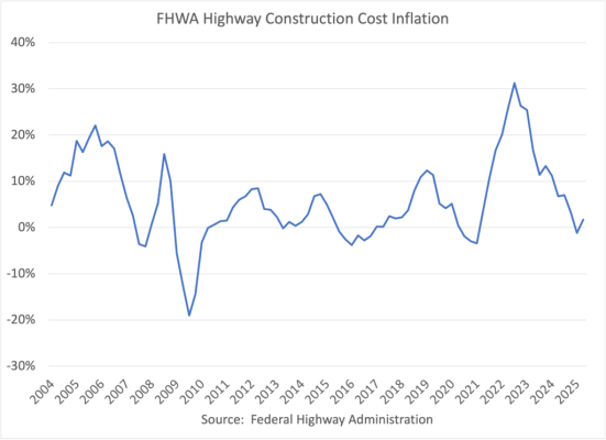 Data published by the Federal Highway Administration show that the rate of construction cost inflation which was heightened a few years ago, has subsided substantially. Construction cost inflation which peaked at nearly 30 percent per annum in 2022 has fallen sharply; the index is up just 1.7 percent over the last year (through the second quarter of 2025).