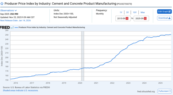 The cost of concrete continues to rise and is up about 2 percent over the past 12 months.