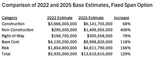 In fact, according to data reported by IBR in 2025, annual inflation averaged about 6.98 percent per year between 2020 and 2025 (this is a composite of construction costs, engineering costs, and right-of-way costs weighted by IBR budget categories). In the aggregate, prices increased about 22 percent between the 2022 and 2025 estimates. At 2 percent per year, slightly more than a 6 percent three-year increase was already built into the IBR cost estimate.