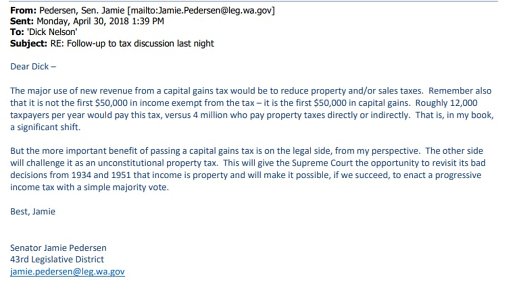 Sen. Pedersen’s email was revealing in another way, too. He admitted the “more important benefit” of the capital gains tax was on “the legal side.” The goal was to provoke a court challenge that would give the Supreme Court a chance to overturn prior rulings that income is property under the state constitution. If they could reclassify income, it would “make it possible to enact a progressive income tax with a simple majority vote.”