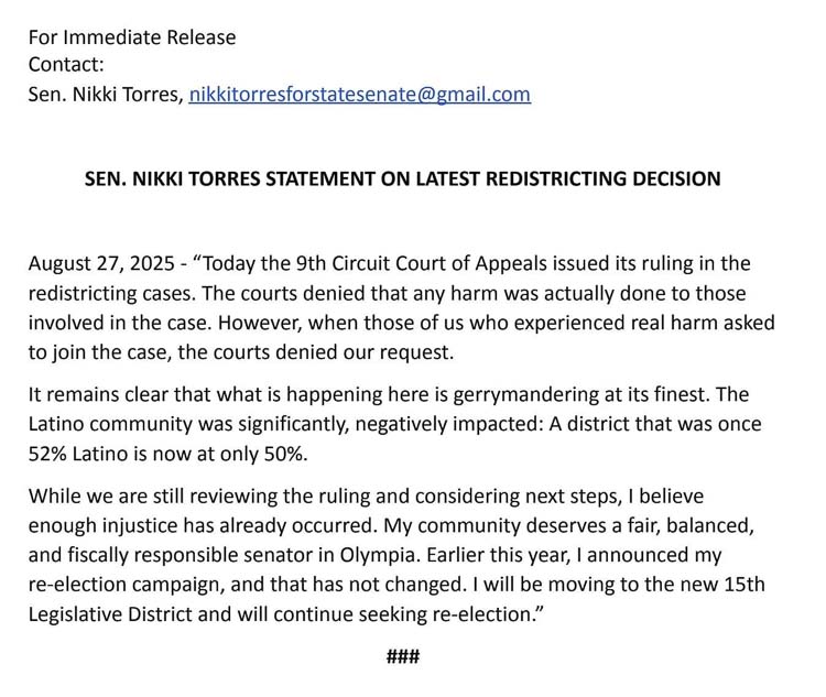 - Impact: As the first Latina senator elected in Central Washington (2022), Torres was ousted from LD-15. She can serve out her term (ending 2026) but must relocate to run again. Torres criticized the map as “gerrymandering” that harms Latino representation, echoing Republican claims of partisan bias favoring Democrats.