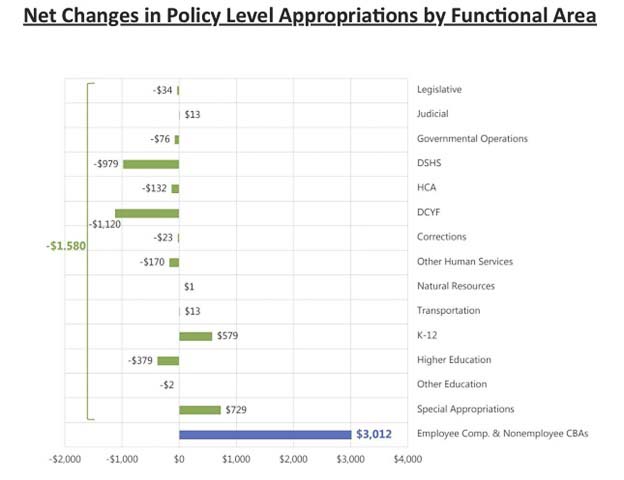 In terms of funding cuts, the majority party took $1.2 billion from the Department of Children, Youth, and Families. The second largest cut was $979 million from the Department of Social and Health Services. Don’t forget, these cuts are AFTER raising General Fund taxes by $9.5 billion.