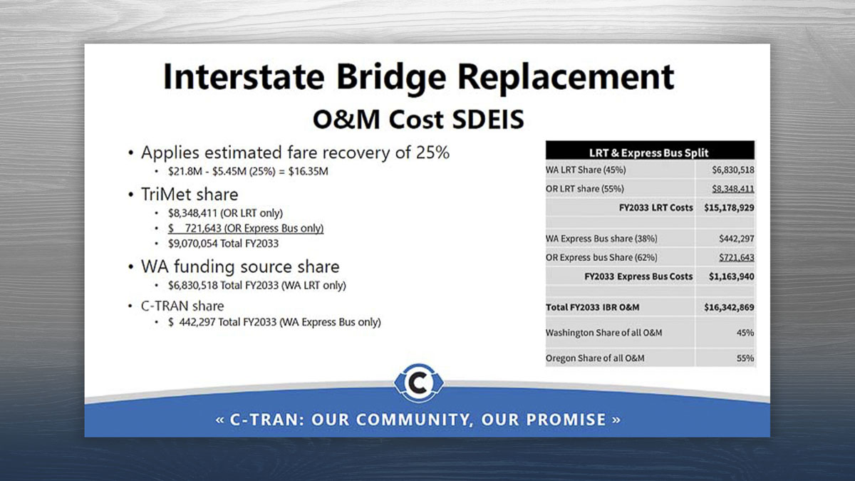 Adding the $4.2 million annually for existing C-TRAN service and the full $7.2 million for the transit component of the I-5 Bridge replacement project indicates Vancouver would be on the hook for an additional $11.4 million annually.