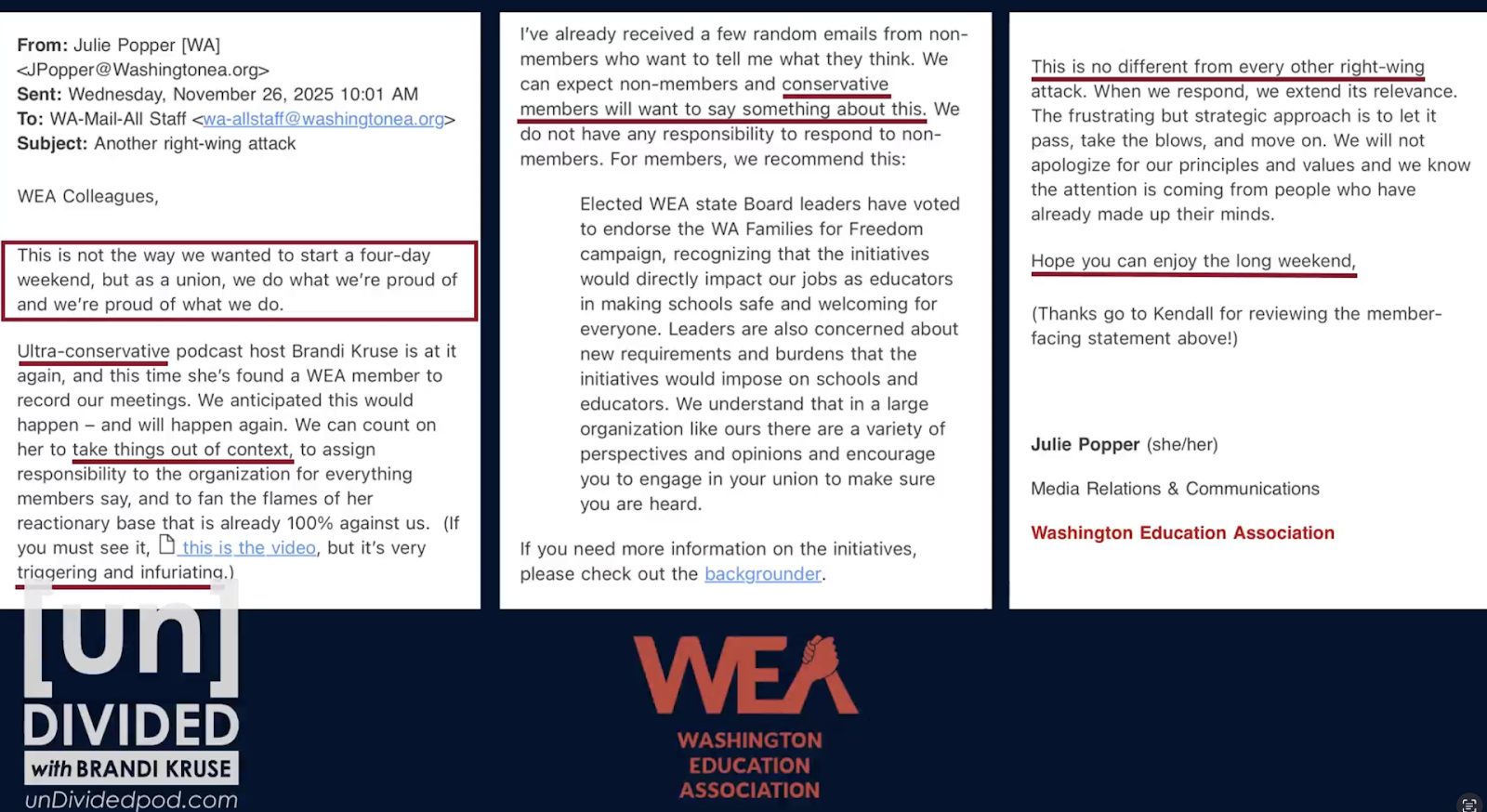 Kruse wrapped up the recap by sharing an email that was quietly distributed only to members of the WEA that agree with the radical ideology of the organization’s leadership.