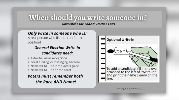 Third, the general election write-in candidate will NOT appear in the voters pamphlet, nor will he or she be on the ballot. This is the price the last-minute candidate pays for not jumping into the primary race. This problem is why most write-in campaigns fail. Why wasn’t the candidate organized enough or knowledgeable enough to file during filing week or run in the primary?