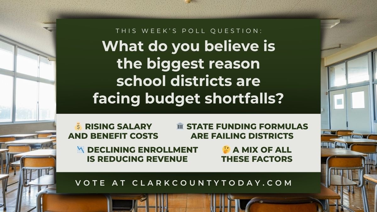 As school districts warn of budget shortfalls, layoffs and reductions to programs, opinions differ on what is causing the financial pressure. Some point to rising salary and benefit costs, others blame state funding formulas, while many cite declining enrollment or a combination of factors. In this week’s poll, Clark County Today asks: What do you believe is the biggest reason school districts are facing budget shortfalls?